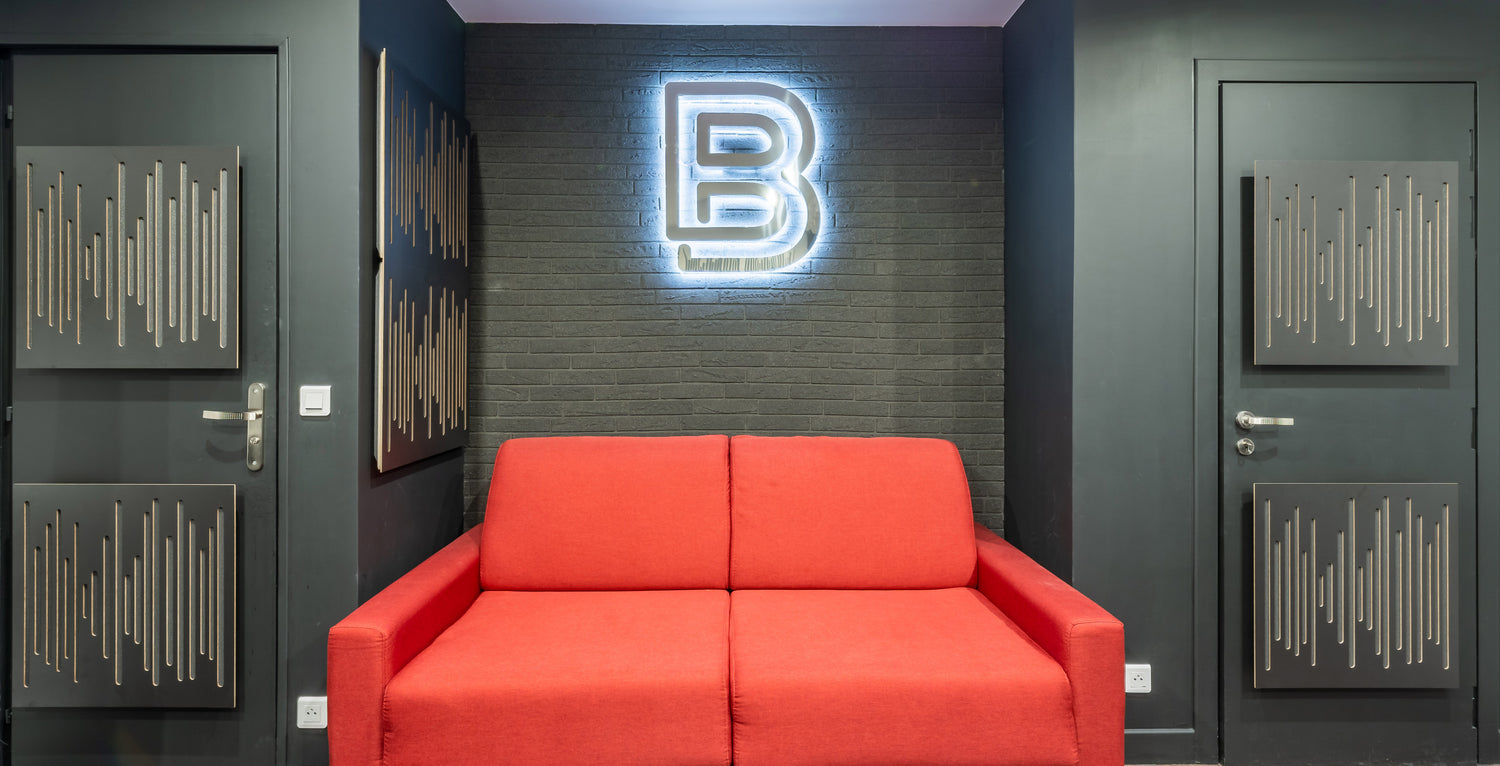 BAZS Studio à pensé à tout. La salle dispose aussi d'un salon pour vous détendre avec un canapé confortable et une cuisine équipé d'un frigidaire pour les longues sessions d'enregistrement. Vous restez à proximité de l'ingénieur pour pouvoir l'écouter mixer vos prises.
